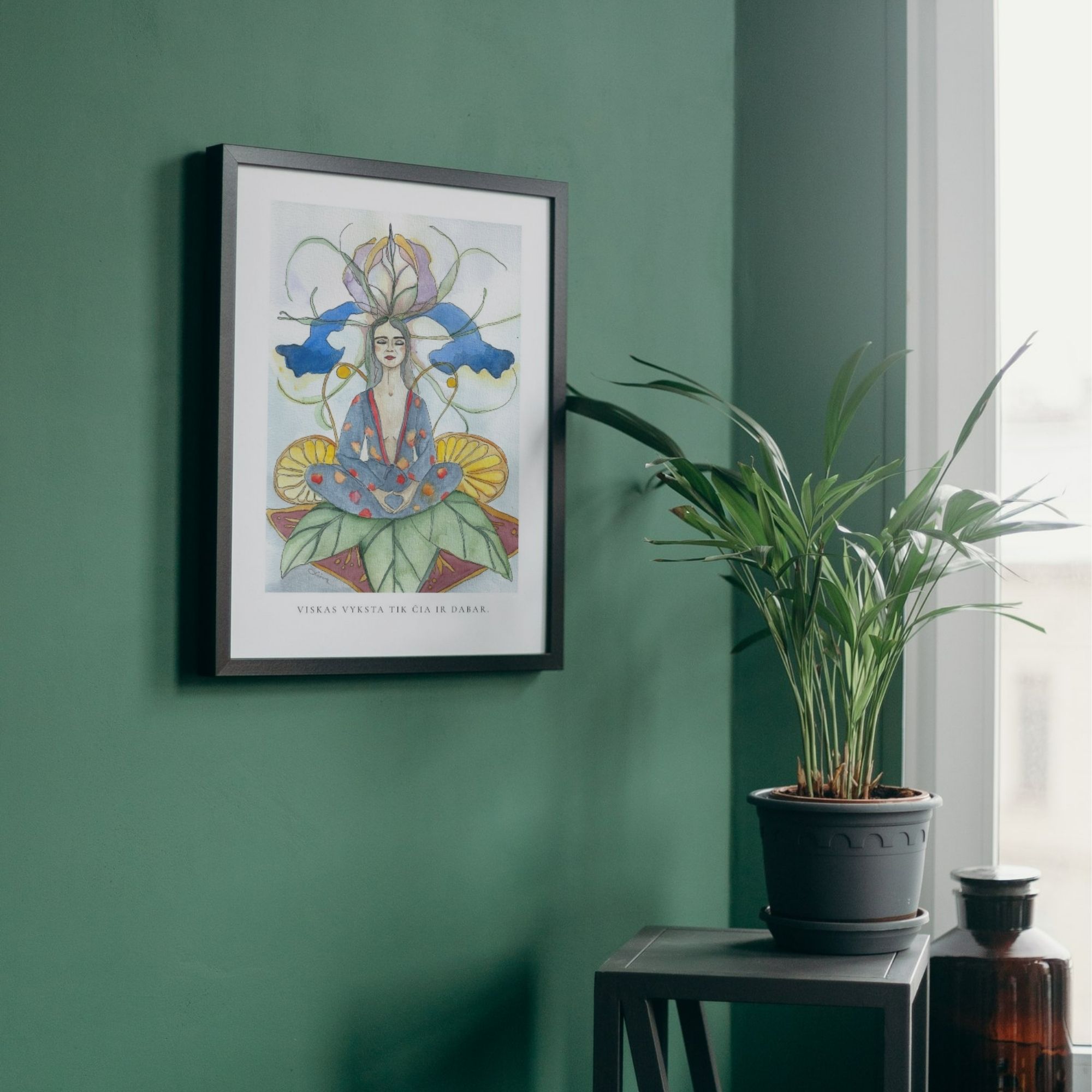 Kūrinio centre – ramiai sėdinti moteris, apsupta augalų, spalvų ir formų. Tai vaizdas apie vidinę ramybę ir momentą, kuriame galima tiesiog būti.