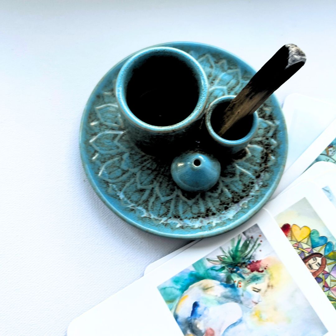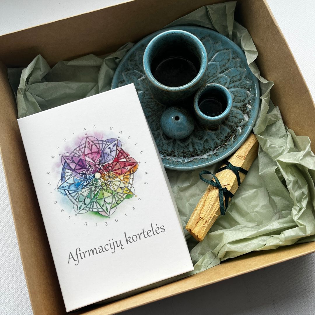 Dovanų rinkinys „Ritualai“ – jūsų kasdieniams ramybės ir įkvėpimo ritualams. Rinkinyje rasite afirmacijų korteles moterims, keraminę žvakidę-smilkalinę ir Palo Santo lazdelę – švelnų būdą pradėti dieną pozityviai ir sukurti jaukią atmosferą namuose.