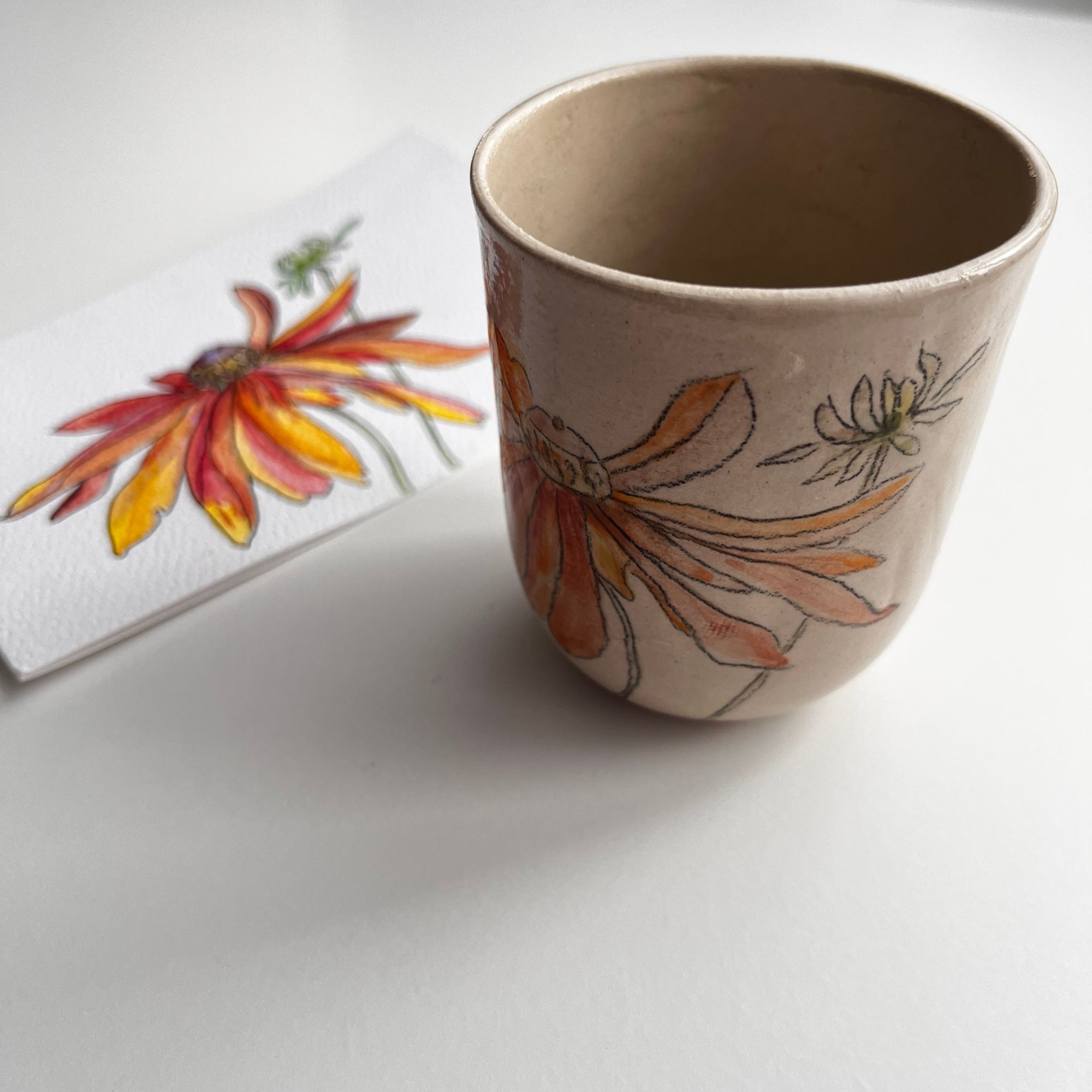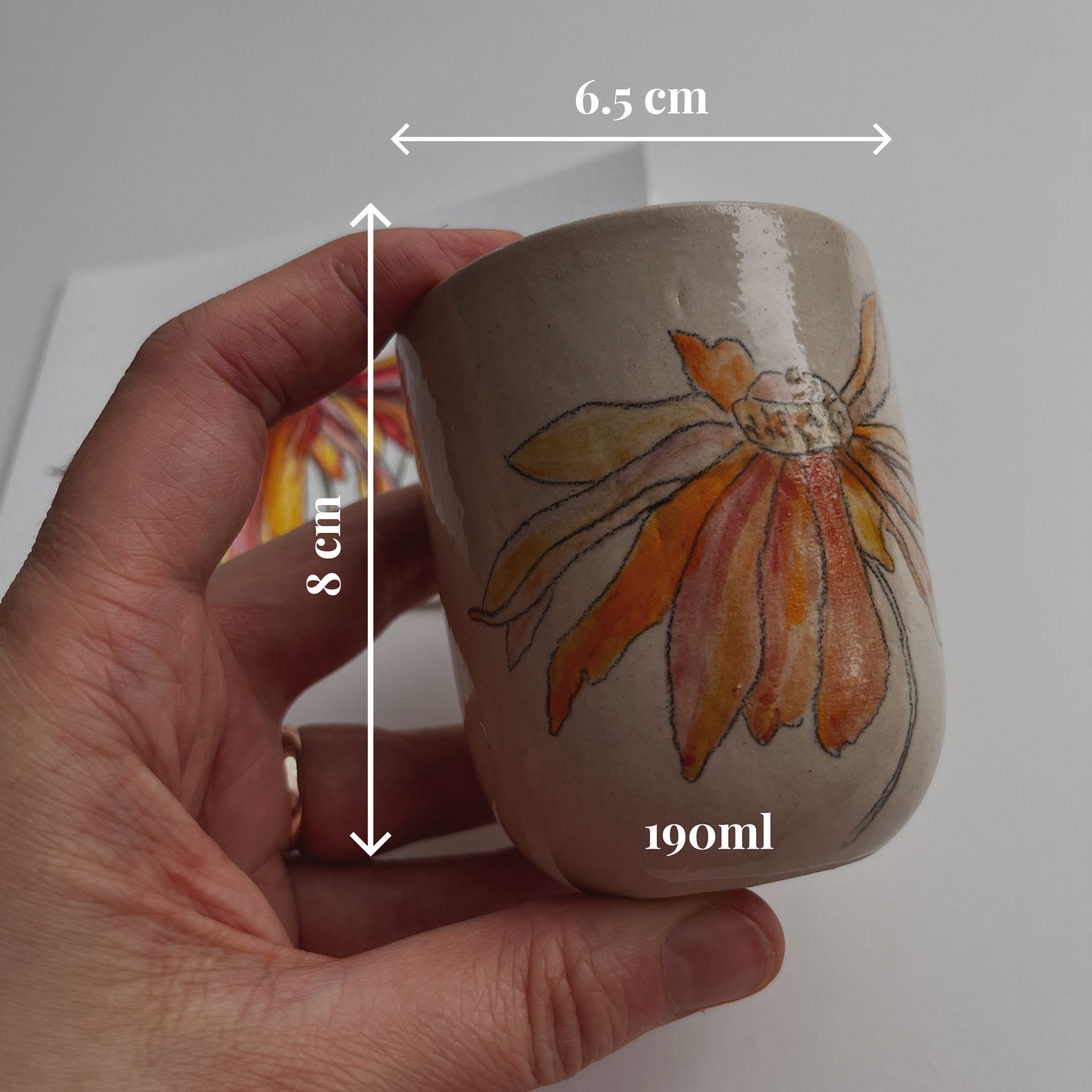 Puodelį puošia mano piešta ežiuolės akvarelės iliustracija. Kartu pridedamas atvirukas su tuo pačiu augalu – mažas, jaukus derinys, tinkantis tiek kasdieniams ritualams, tiek dovanai.